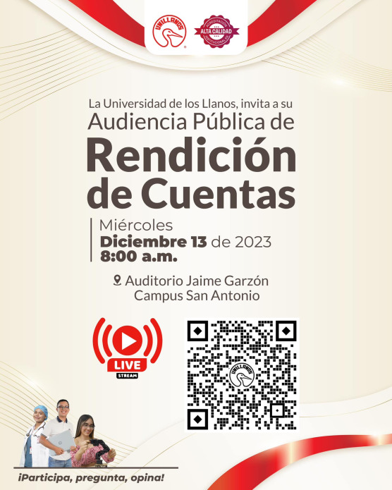 La Universidad de los Llanos invita a la comunidad universitaria y a la ciudadanía en general, a participar en la Audiencia Pública de Rendición de Cuentas, vigencia 2023, la cual se llevará a cabo el miércoles 13 de diciembre, a partir de las 8:00 a.m. en el Auditorio Jaime Garzón del campus San Antonio en Villavicencio.