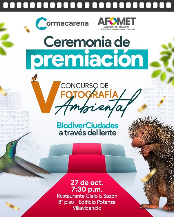 Con el objetivo de reconocer el talento de quienes lograron capturar en imágenes la relación viva entre lo urbano y lo natural del Meta, Cormacarena invita a la comunidad a participar en la ceremonia de premiación del V Concurso de Fotografía Ambiental 2025, que se llevará a cabo hoy 27 de octubre en el restaurante Cielo & Sazón en el 8.° piso del Edificio Potenza a las 7:30 de la noche.