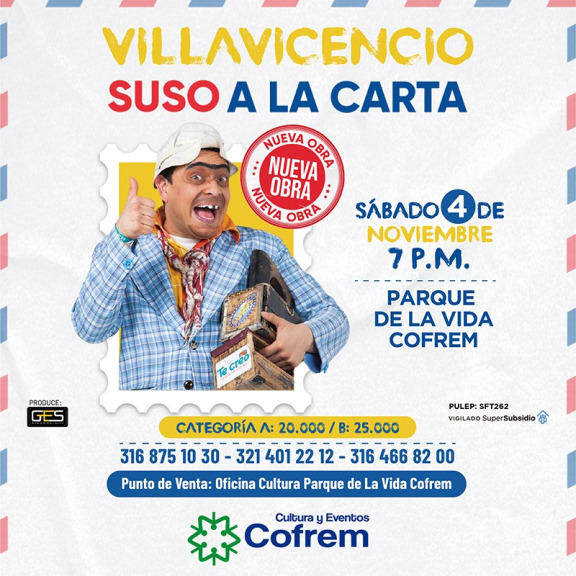 Cultura y Eventos Cofrem invita a divertirse en el sensacional espectáculo humorístico, ‘Suso a la Carta’, que está programado para realizarse desde las 7 de la noche de este sábado 4 de noviembre en el Parque de la Vida de la capital del Meta.