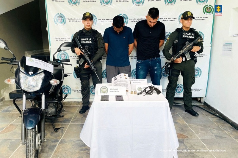 Se logró la incautación de una motocicleta, panfletos extorsivos y equipos móviles.