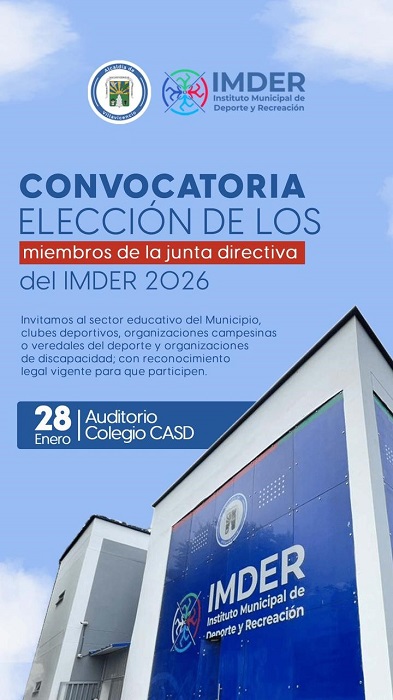 El Instituto Municipal de Deporte y Recreación (Imder) realizará este miércoles 28 de enero la elección de los nuevos integrantes de su Junta Directiva para la vigencia 2026, proceso cuya convocatoria permanecerá abierta hasta este martes.
