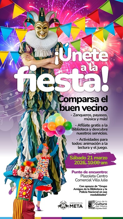 Con el propósito de fortalecer el acceso al conocimiento y promover el hábito de la lectura en el departamento, se realizará la jornada comparsa “El Buen Vecino”, un espacio que, a través de actividades culturales, zanqueros, payasos y juegos, busca integrar a la comunidad en torno a la lectura y la cultura. La actividad iniciará a las 10:00 a. m. en la plazoleta del Centro Comercial Villa Julia, en el centro de la ciudad este 21 de marzo.