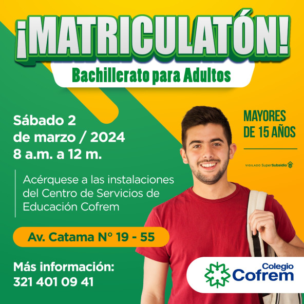 El Colegio Cofrem Villaviencio invita a aprovechar este sábado 2 de marzo la matriculatón del programa para adultos y mayores de 15 años, prevista para realizarse en la institución de la Caja de Compensación Familiar Cofrem.