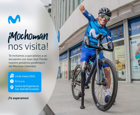 Juan José Florián, también conocido como «Mochoman», ciclista paralímpico de Movistar Colombia, visita San José del Guaviare para participar en la carrera ciclista de MTB Clásica del Guaviare y compartir acciones con Movistar, empresas locales, Alcaldía y Gobernación.