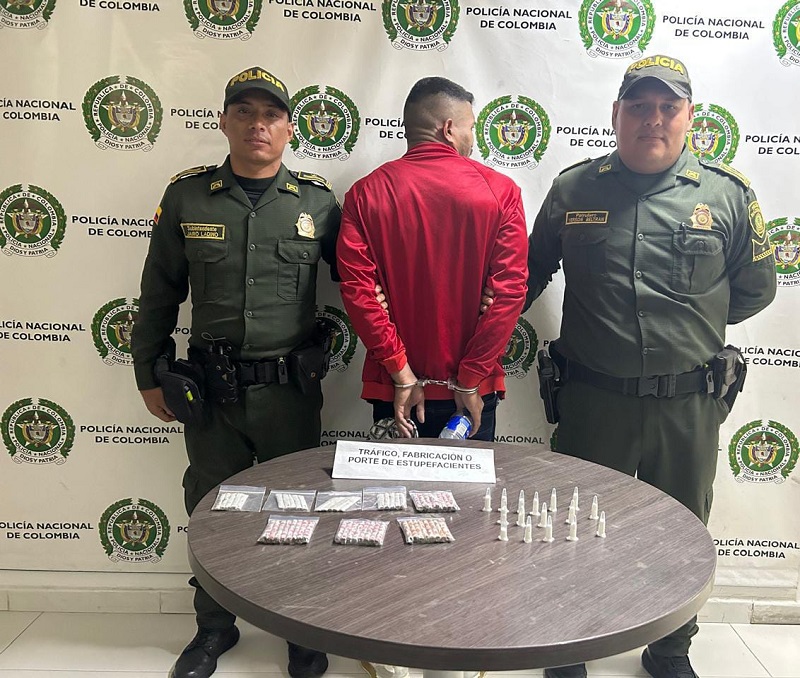 En la Calle 52 sur con carrera 33 via pública Barrio el Darién, uniformados de la Policía Nacional efectuaron la captura en flagrancia de un hombre 34 años, por el delito Tráfico, Fabricación o Porte de Estupefacientes.